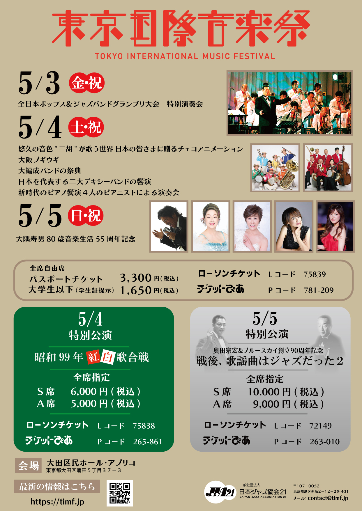| 日程 | 【5月3日】 ■全日本ポップス&ジャズバンドグランプリ大会 特別演奏会 開場:11:30 / 開演:11:45 大ホール 【5月4日】 ■悠久の音色"二胡"が歌う世界 日本の皆さまに贈るチェコアニメーション 開場:9:30 / 開演:10:00 小ホール ■大編成バンドの祭典 開場:12:30 / 開演:13:00 小ホール ■日本を代表する二大デキシーバンドの響演 開場:16:30 / 開演:17:30 小ホール ■華麗なるトリプルピアノ 開場:12:30 / 開演:13:00 大ホール 【5月5日】 ■大隅寿男80歳音楽生活55周年記念 開場:16:30 / 開演:17:30 小ホール |