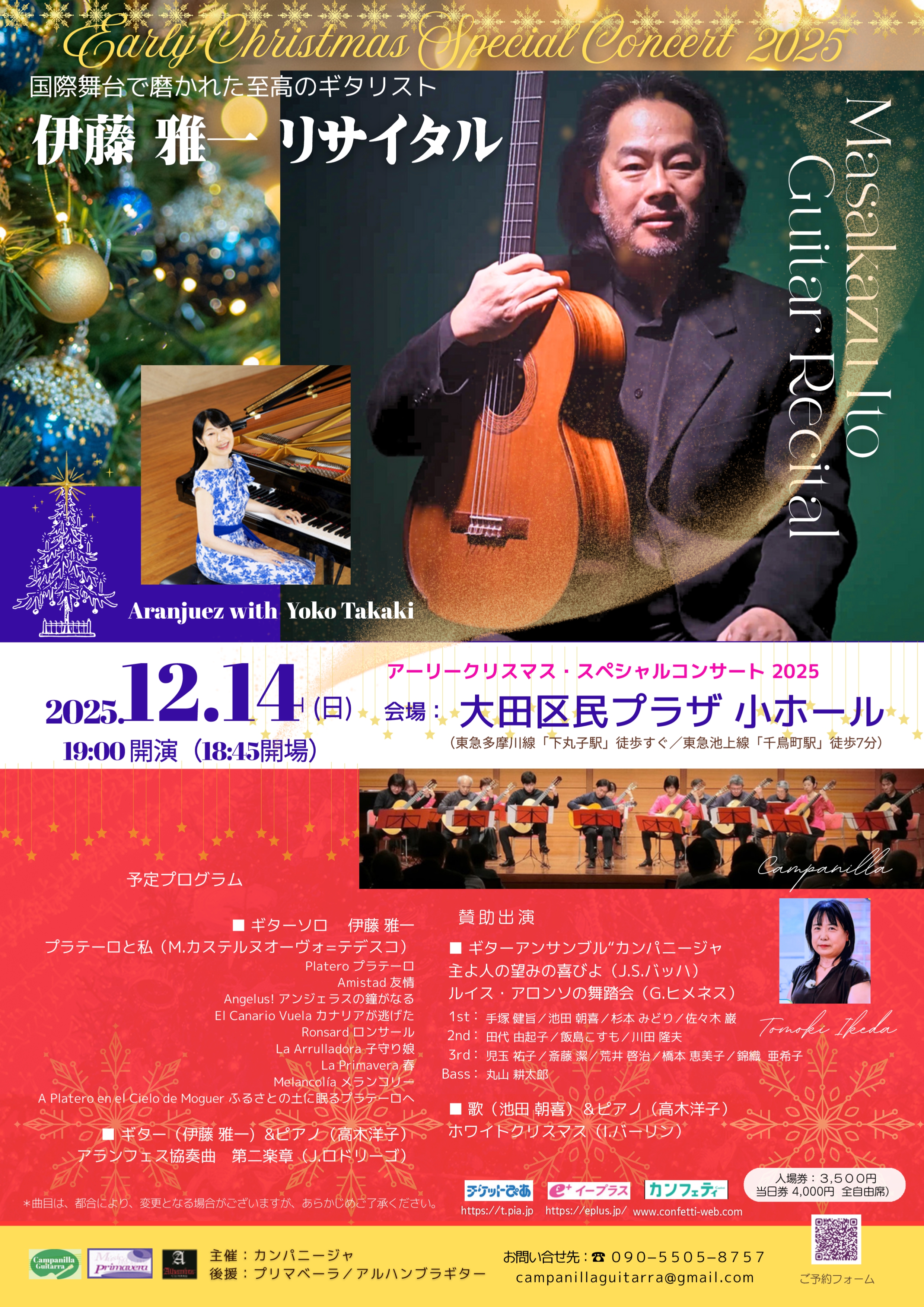カンパニージャが贈る毎年恒例のアーリークリスマスコンサート。今年は1987年の東京デビュー直後渡米、アメリカを中心に各地で演奏活動、教授活動を行っているクラシックギタリスト伊藤雅一をゲストに迎え開催します。