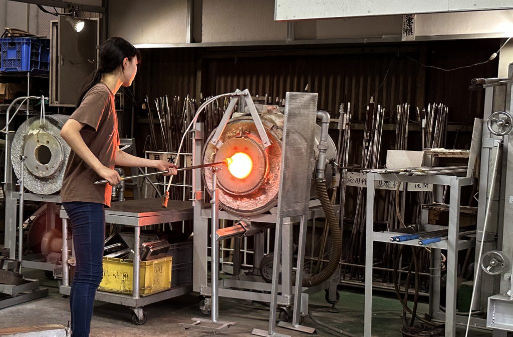 *吹きガラス:高温で溶かしたガラスを金属製の吹き竿に巻き取り、息を吹き込んで成形するガラス工芸の技法。