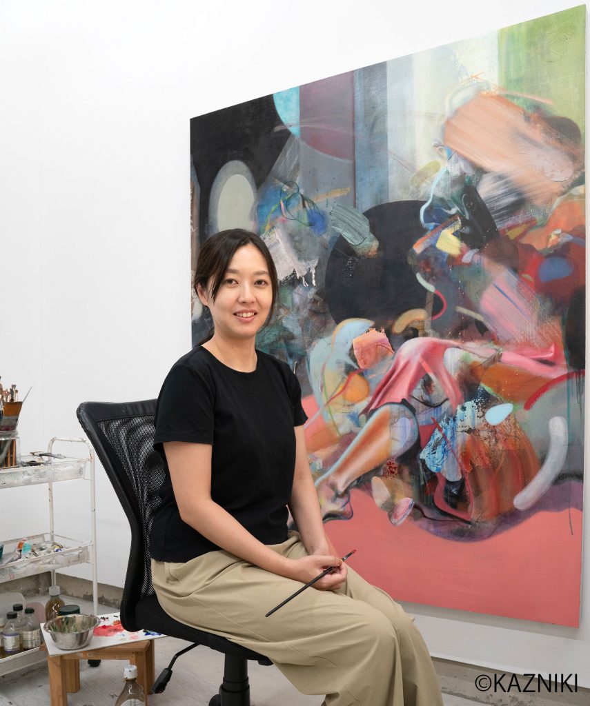 「表層と内層が織り重なって一つの画面になっています。描き始めはあえて完成図を想定しません。1日1日の新鮮な感性を重視して絵の具を乗せていきます。時間をかけて描き進めていた箇所が後半見えなくなったり、ナイフで削ることもあり、遠回りをしているようにも思いますが、私にとっては正直なキャンバスの向き合い方です。」