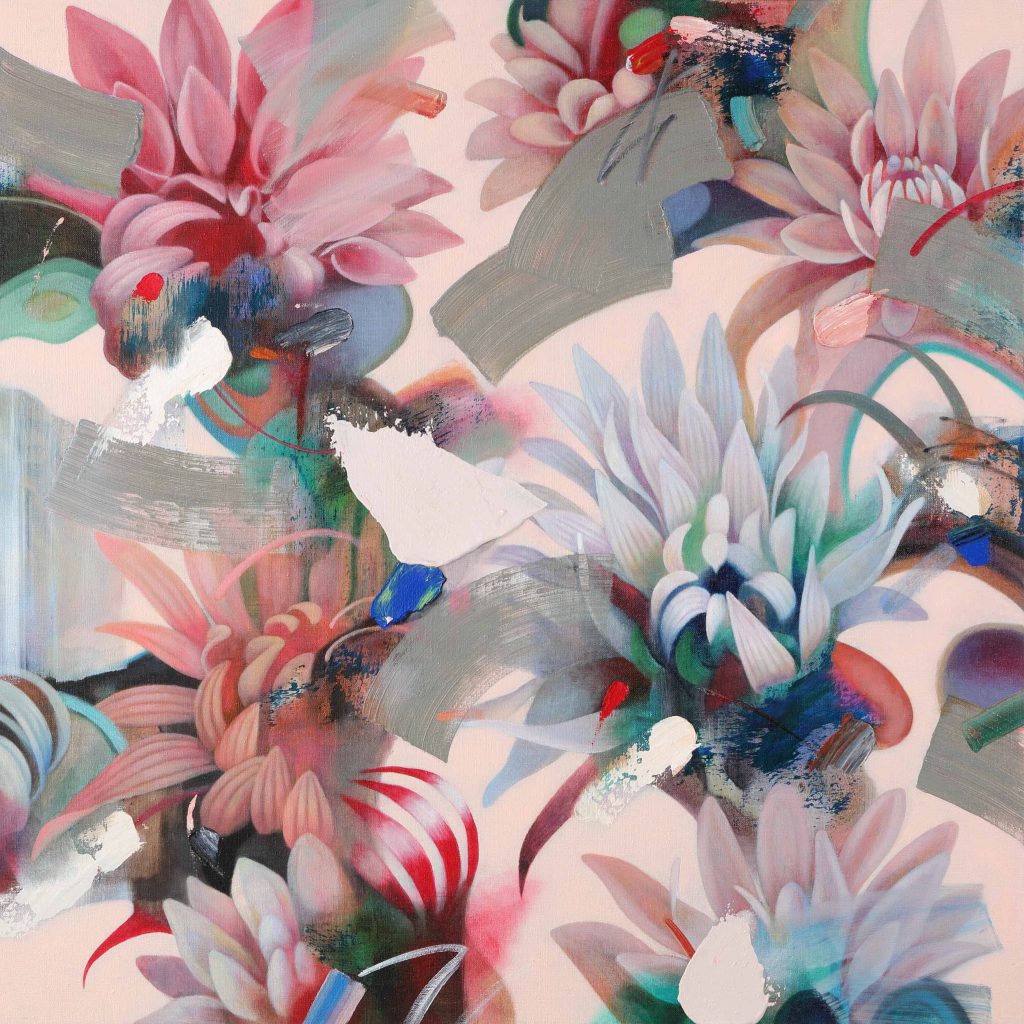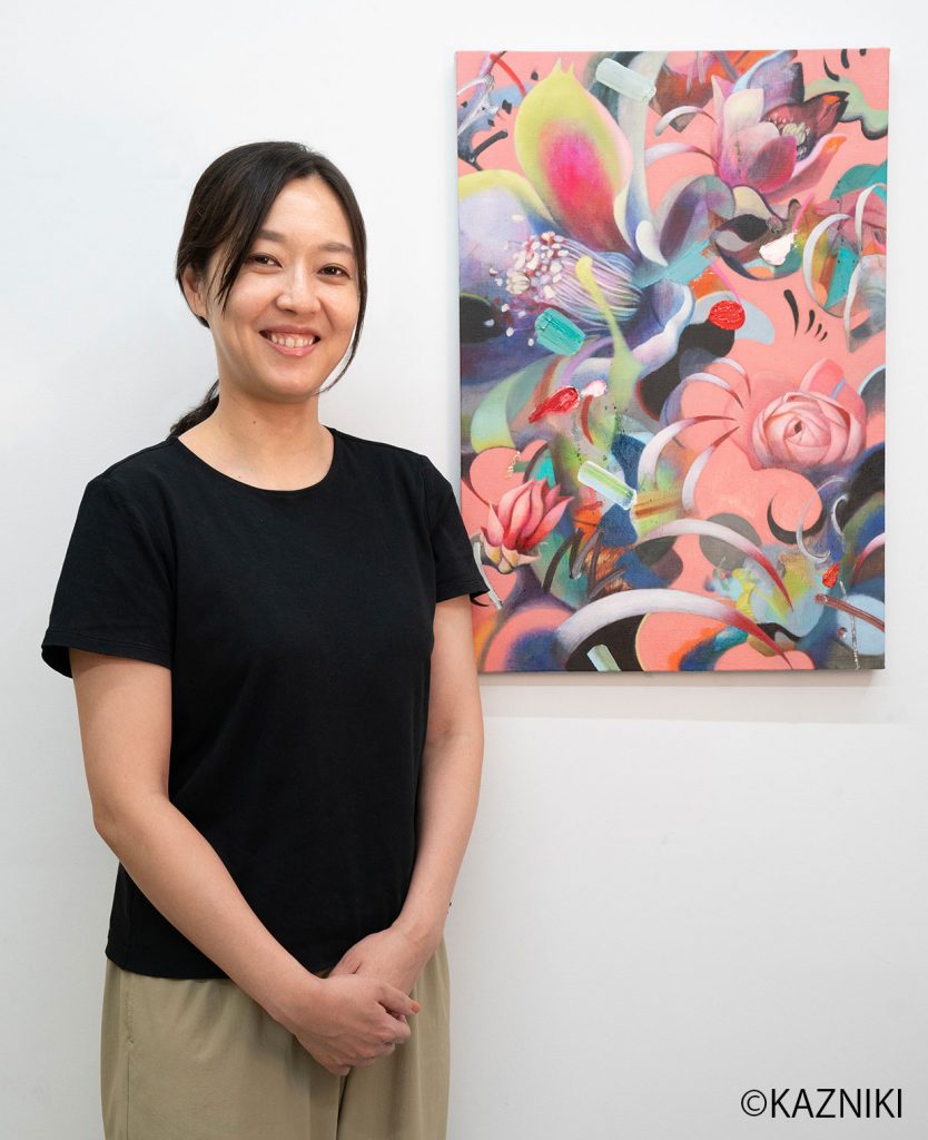 「子供の頃から建物や日用品などの人工物より自然を描くことが好きでした。私が生まれ育った大田区は、大自然があるわけではないけれど、住宅街の中に木々が植えられていたり、お庭に綺麗な花が咲いていたりします。デビュー当初に発表していたシリーズ「GARDEN」は、近所の住宅のお庭に咲く花や、時々見かける蝶をモチーフに描いていました。私の日常で特に目をひくモチーフが花だったのだと思います。」