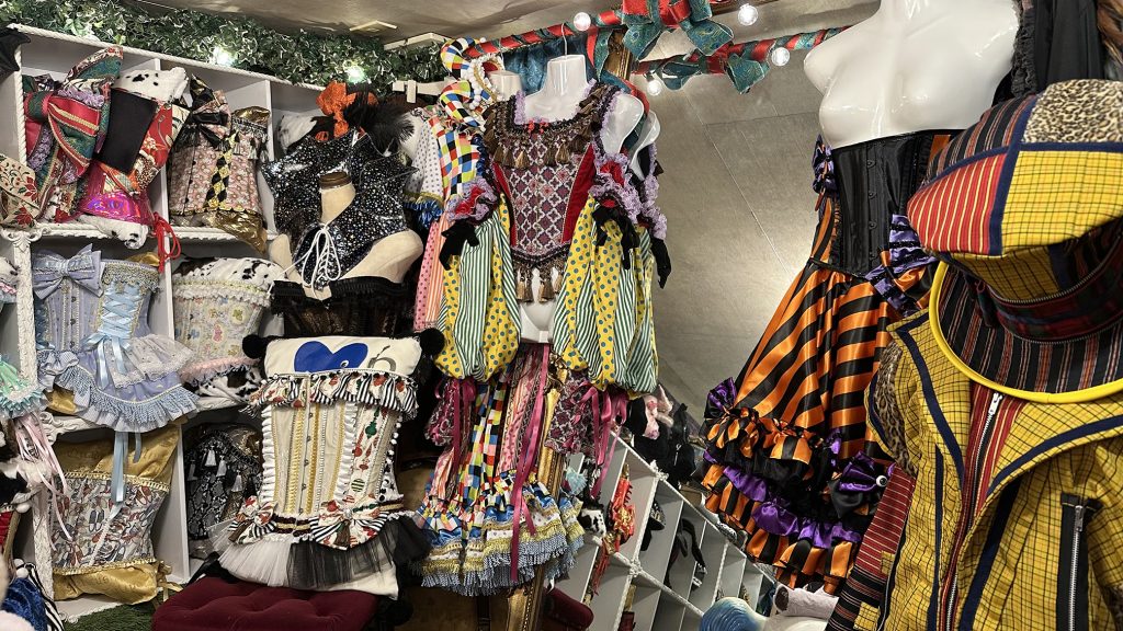 「ゴス・ファッション・ファンの方やバンドマンやライブに行かれる方たち。それ以外では舞台関係とジャグリングやポールダンサー、占い師といったパフォーマーさんたちです。あとは専門学校の入学式用にお作りすることもあります。販売は通販とオーダーが中心です。衣装などは打ち合わせしなければいけないので、ここに来ていただいています。」