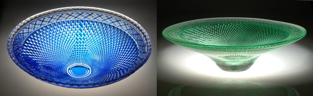 竹細工を切子で表現した大本さんの作品。『青被切子鉢』と『緑被硝子切子皿』
